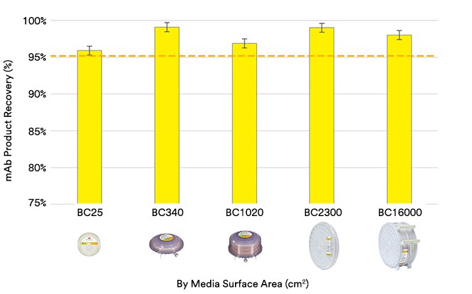 Fibrous chromatographic clarification assures scalable performance from discovery to manufacturing which allows for faster speed to clinic and market. Performance is consistent from laboratory capsules (BC4 and BC25), to scale-up capsules (BC340 and BC1020), to production capsules (BC2300 and BC16000).